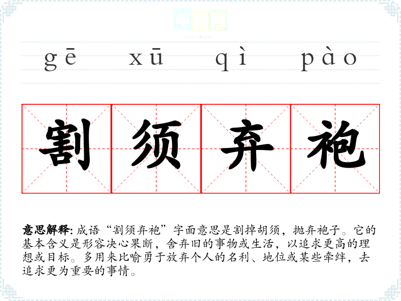 成语“割须弃袍”字面意思是割掉胡须,抛弃袍子。它的基本含义是形容决心果断,舍弃旧的事物或生活,以追求更高的理想或目标。多用来比喻勇于放弃个人的名利、地位或某些牵绊,去追求更为重要的事情。