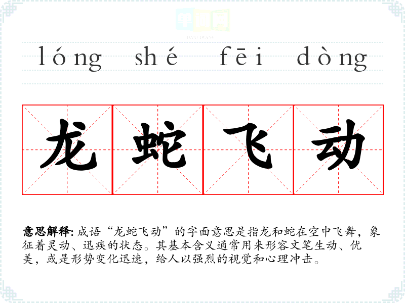 “龙蛇飞动”源自古代的文人描述,常常用来形容书法、绘画等艺术形式的生动表现。这个成语可能与道家文化中的龙和蛇的象征意义有关,龙是力量与权威的象征,而蛇则常常被视为灵活与智慧的代表。