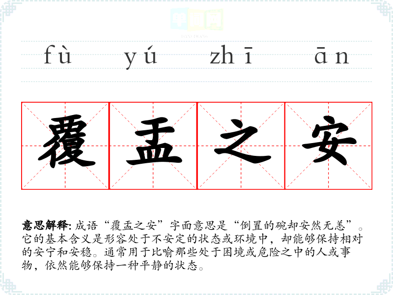 安于覆盂 盂:一种敞口装液体的容器。比翻过来放着的盂还要安稳。比喻非常稳固。