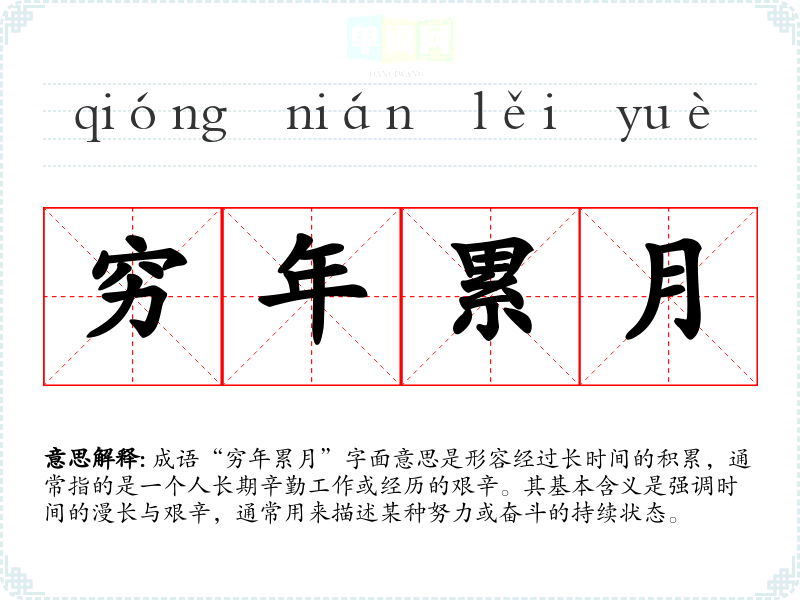 成语“穷年累月”字面意思是形容经过长时间的积累,通常指的是一个人长期辛勤工作或经历的艰辛。其基本含义是强调时间的漫长与艰辛,通常用来描述某种努力或奋斗的持续状态。
