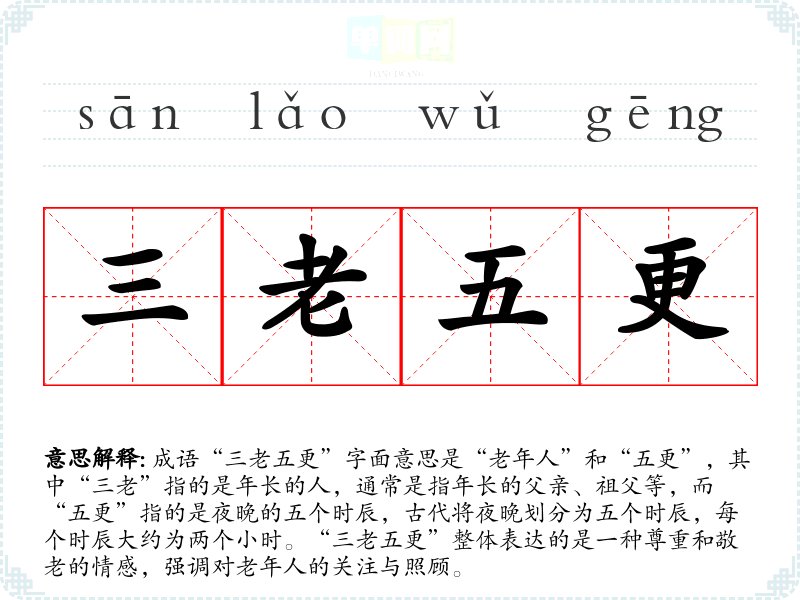 成语“三老五更”字面意思是“老年人”和“五更”,其中“三老”指的是年长的人,通常是指年长的父亲、祖父等,而“五更”指的是夜晚的五个时辰,古代将夜晚划分为五个时辰,每个时辰大约为两个小时。“三老五更”整体表达的是一种尊重和敬老的情感,强调对老年人的关注与照顾。