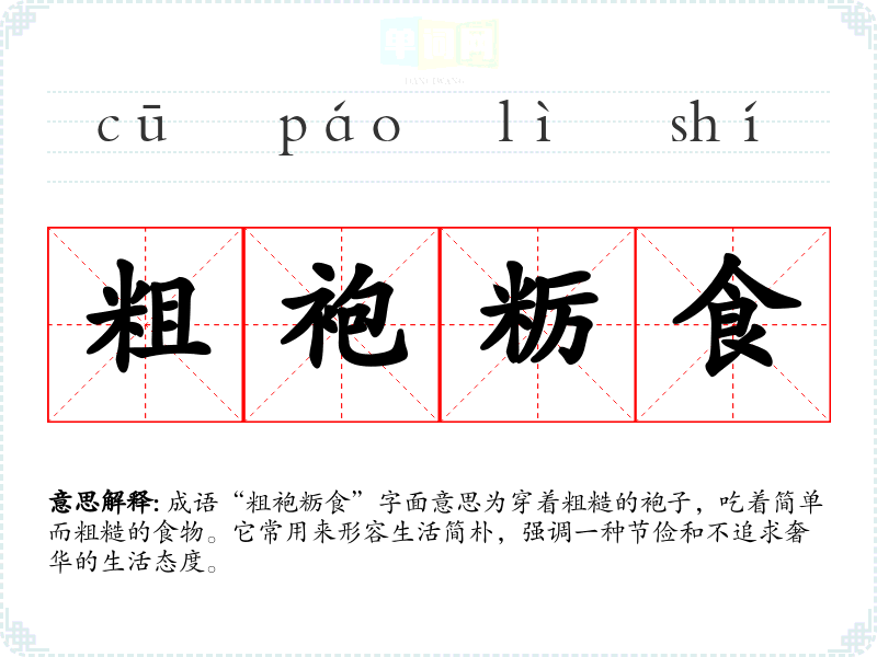 | 粗袍粝食 | 粗劣的衣食。形容生活俭朴。 |