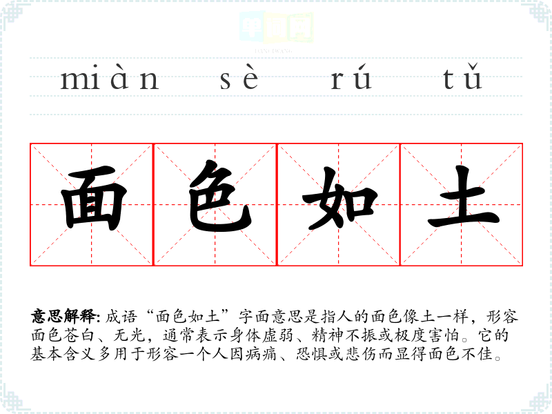 成语“面色如土”字面意思是指人的面色像土一样,形容面色苍白、无光,通常表示身体虚弱、精神不振或极度害怕。它的基本含义多用于形容一个人因病痛、恐惧或悲伤而显得面色不佳。