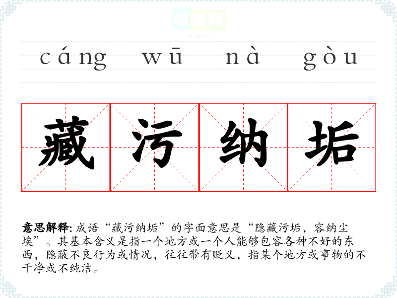 成语“藏污纳垢”的字面意思是“隐藏污垢,容纳尘埃”。其基本含义是指一个地方或一个人能够包容各种不好的东西,隐蔽不良行为或情况,往往带有贬义,指某个地方或事物的不干净或不纯洁。