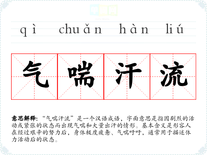 “气喘汗流”是一个汉语成语,字面意思是指因剧烈的活动或紧张的状态而出现气喘和大量出汗的情形。基本含义是形容人在经过艰辛的努力后,身体极度疲惫、气喘吁吁,通常用于描述体力活动后的状态。