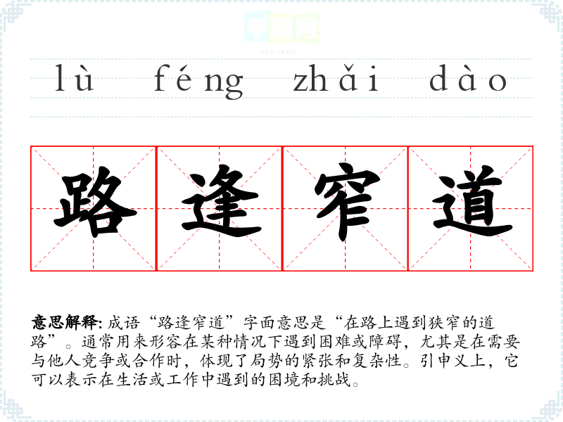 成语“路逢窄道”字面意思是“在路上遇到狭窄的道路”。通常用来形容在某种情况下遇到困难或障碍,尤其是在需要与他人竞争或合作时,体现了局势的紧张和复杂性。引申义上,它可以表示在生活或工作中遇到的困境和挑战。