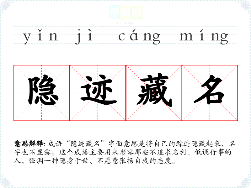 成语“隐迹藏名”字面意思是将自己的踪迹隐藏起来,名字也不显露。这个成语主要用来形容那些不追求名利、低调行事的人,强调一种隐身于世、不愿意张扬自我的态度。