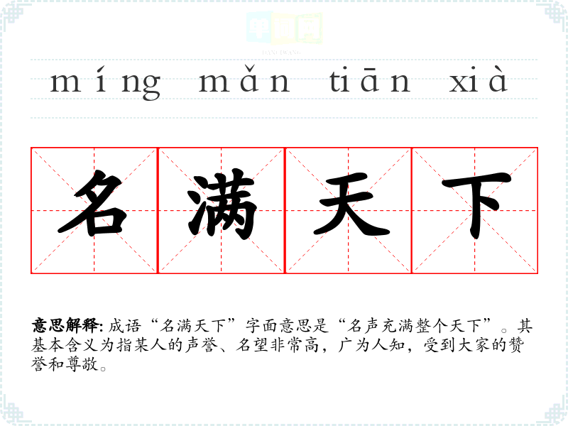 成语“名满天下”字面意思是“名声充满整个天下”。其基本含义为指某人的声誉、名望非常高,广为人知,受到大家的赞誉和尊敬。