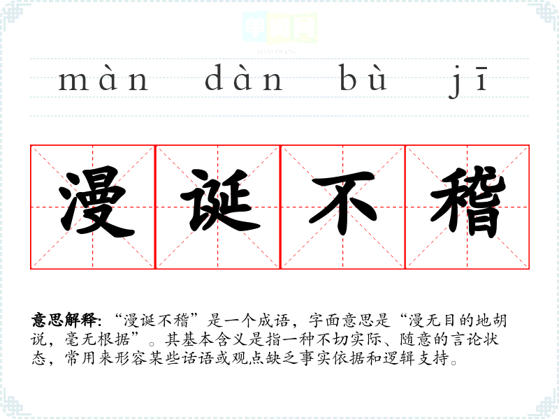 “漫诞不稽”是一个成语,字面意思是“漫无目的地胡说,毫无根据”。其基本含义是指一种不切实际、随意的言论状态,常用来形容某些话语或观点缺乏事实依据和逻辑支持。