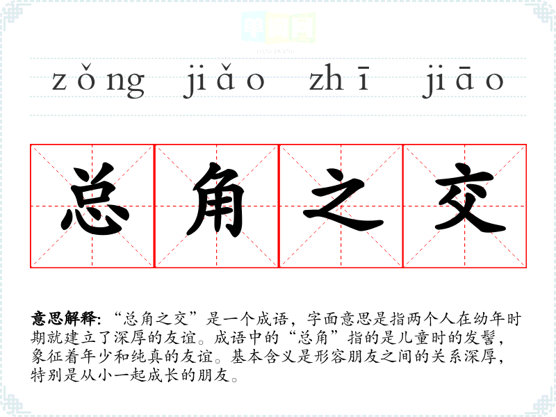 “总角之交”是一个成语,字面意思是指两个人在幼年时期就建立了深厚的友谊。成语中的“总角”指的是儿童时的发髻,象征着年少和纯真的友谊。基本含义是形容朋友之间的关系深厚,特别是从小一起成长的朋友。