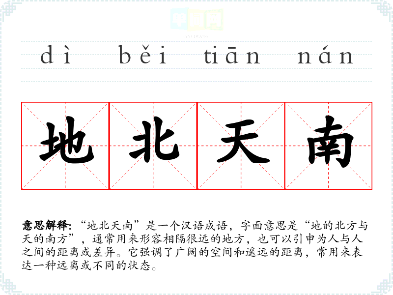 | 地北天南 | 一在地之北,一在天之南。形容地区各不相同。也形容距离极远。 |