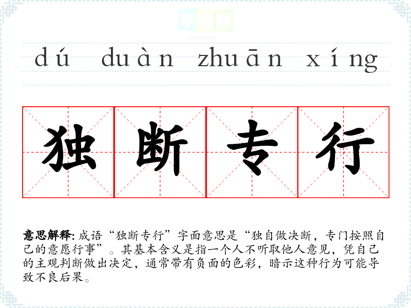 成语“独断专行”字面意思是“独自做决断,专门按照自己的意愿行事”。其基本含义是指一个人不听取他人意见,凭自己的主观判断做出决定,通常带有负面的色彩,暗示这种行为可能导致不良后果。