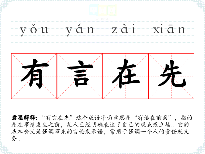 “有言在先”这个成语字面意思是“有话在前面”,指的是在事情发生之前,某人已经明确表达了自己的观点或立场。它的基本含义是强调事先的言论或承诺,常用于强调一个人的责任或义务。