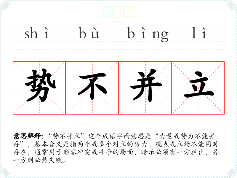 “势不并立”这个成语字面意思是“力量或势力不能并存”,基本含义是指两个或多个对立的势力、观点或立场不能同时存在,通常用于形容冲突或斗争的局面,暗示必须有一方胜出,另一方则必然失败。