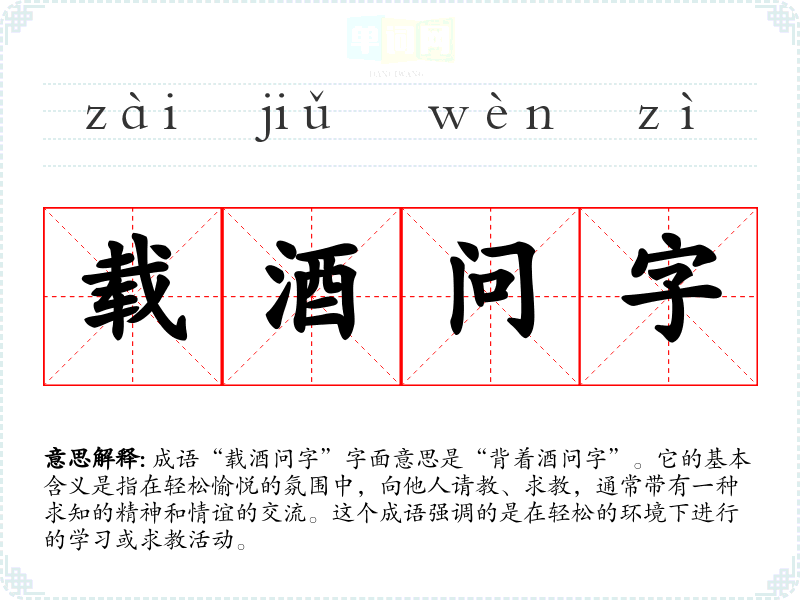 成语“载酒问字”字面意思是“背着酒问字”。它的基本含义是指在轻松愉悦的氛围中,向他人请教、求教,通常带有一种求知的精神和情谊的交流。这个成语强调的是在轻松的环境下进行的学*或求教活动。