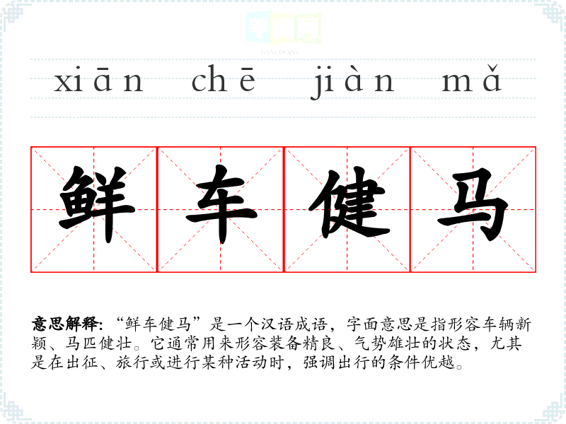 “鲜车健马”是一个汉语成语,字面意思是指形容车辆新颖、马匹健壮。它通常用来形容装备精良、气势雄壮的状态,尤其是在出征、旅行或进行某种活动时,强调出行的条件优越。