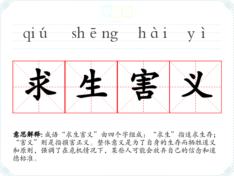 成语“求生害义”由四个字组成:“求生”指追求生存;“害义”则是指损害正义。整体意义是为了自身的生存而牺牲道义和原则,强调了在危机情况下,某些人可能会放弃自己的信念和道德标准。
