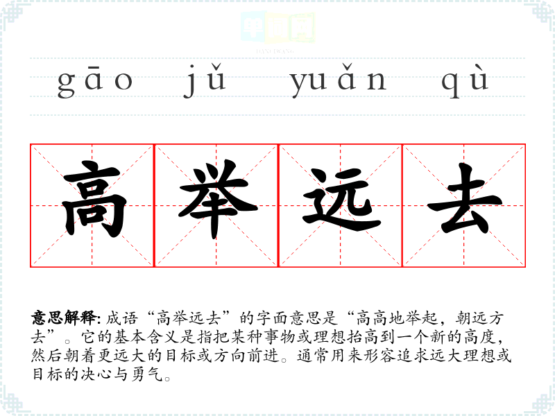 成语“高举远去”的字面意思是“高高地举起,朝远方去”。它的基本含义是指把某种事物或理想抬高到一个新的高度,然后朝着更远大的目标或方向前进。通常用来形容追求远大理想或目标的决心与勇气。