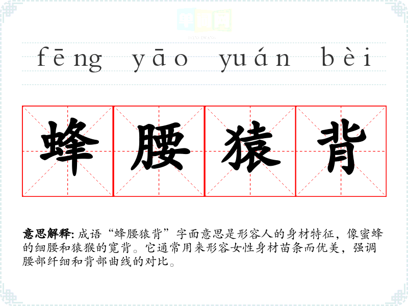 成语“蜂腰猿背”字面意思是形容人的身材特征,像蜜蜂的细腰和猿猴的宽背。它通常用来形容女性身材苗条而优美,强调腰部纤细和背部曲线的对比。