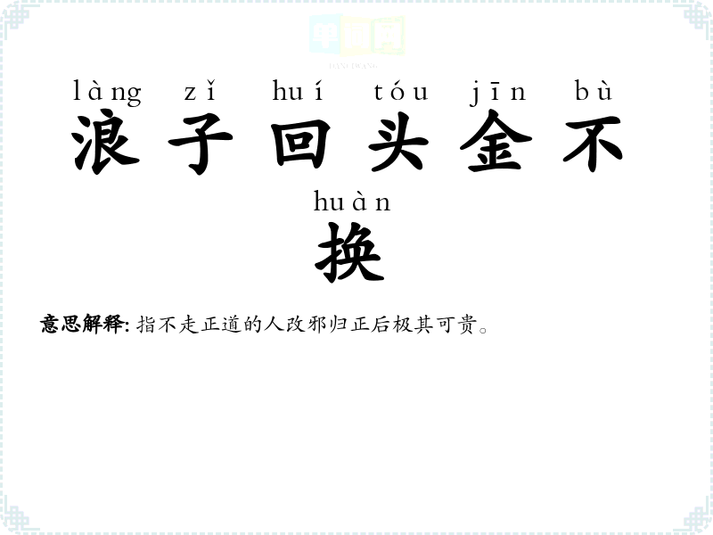 | 浪子回头金不换 | 指不走正道的人改邪归正后极其可贵。 |