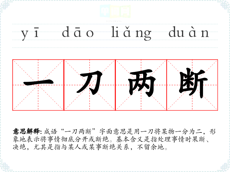 成语“一刀两断”字面意思是用一刀将某物一分为二,形象地表示将事情彻底分开或断绝。基本含义是指处理事情时果断、决绝,尤其是指与某人或某事断绝关系,不留余地。