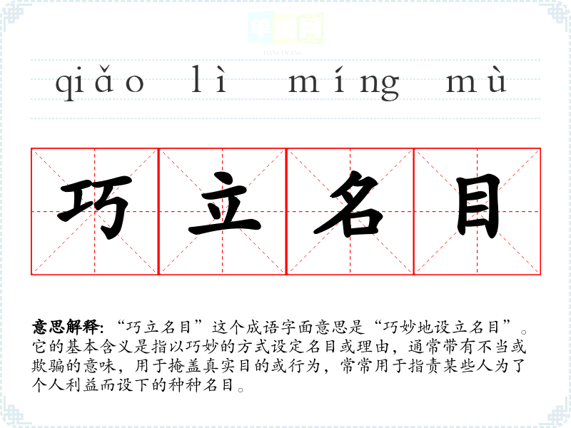 “巧立名目”这个成语字面意思是“巧妙地设立名目”。它的基本含义是指以巧妙的方式设定名目或理由,通常带有不当或欺骗的意味,用于掩盖真实目的或行为,常常用于指责某些人为了个人利益而设下的种种名目。