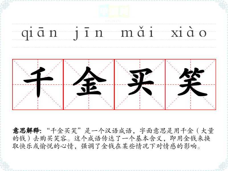 “千金买笑”是一个汉语成语,字面意思是用千金(大量的钱)去购买笑容。这个成语传达了一个基本含义,即用金钱来换取快乐或愉悦的心情,强调了金钱在某些情况下对情感的影响。