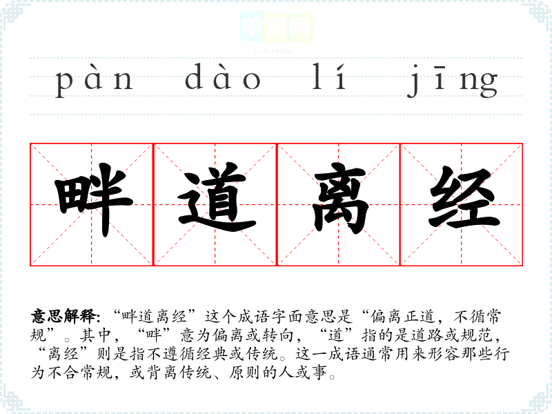 | 畔道离经 | 畔:通“叛”,违背。违背道德,脱离经典。指背离常规的思想或行为。 |