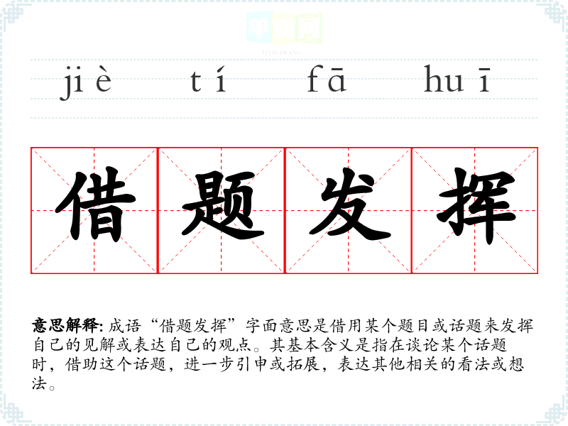 成语“借题发挥”字面意思是借用某个题目或话题来发挥自己的见解或表达自己的观点。其基本含义是指在谈论某个话题时,借助这个话题,进一步引申或拓展,表达其他相关的看法或想法。