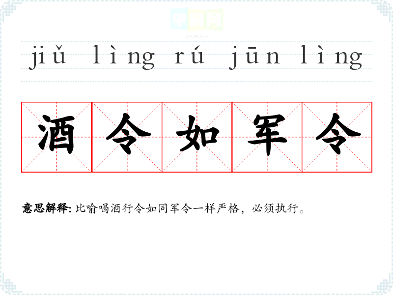 | 酒令如军令 | 比喻喝酒行令如同军令一样严格,必须执行。 |