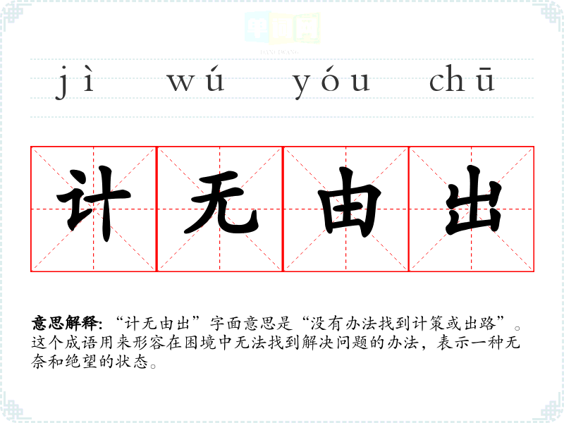 “计无由出”字面意思是“没有办法找到计策或出路”。这个成语用来形容在困境中无法找到解决问题的办法,表示一种无奈和绝望的状态。