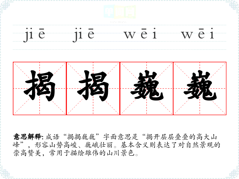 成语“揭揭巍巍”字面意思是“揭开层层叠叠的高大山峰”,形容山势高峻、巍峨壮丽。基本含义则表达了对自然景观的崇高赞美,常用于描绘雄伟的山川景色。