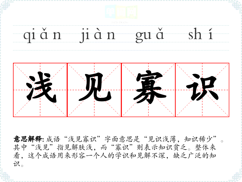 | 浅见薄识 | 浅见:肤浅的见解;薄识:见识很少。形容见闻不广,所知不多。 |