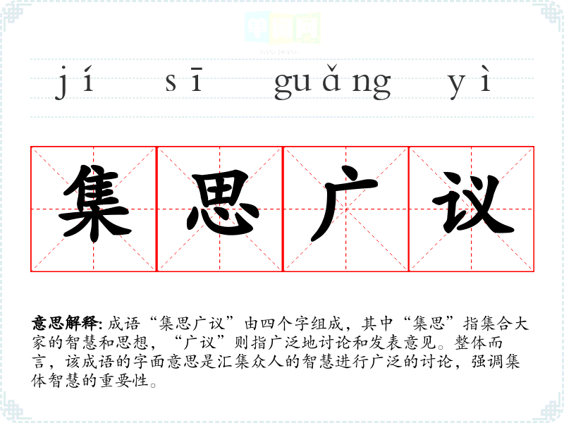 | 集思广议 | 集:聚集;思:思考,智慧;议:议论。集中众人智慧,广泛进行议论 |