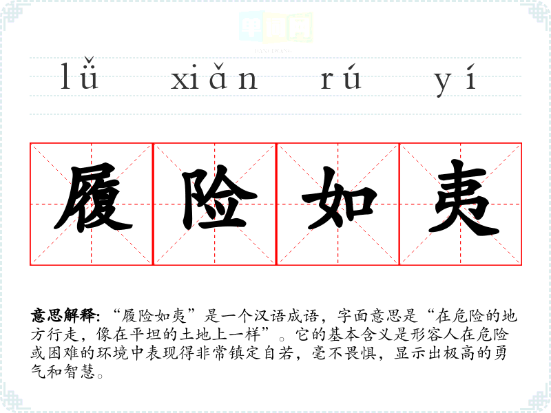 “履险如夷”是一个汉语成语,字面意思是“在危险的地方行走,像在平坦的土地上一样”。它的基本含义是形容人在危险或困难的环境中表现得非常镇定自若,毫不畏惧,显示出极高的勇气和智慧。