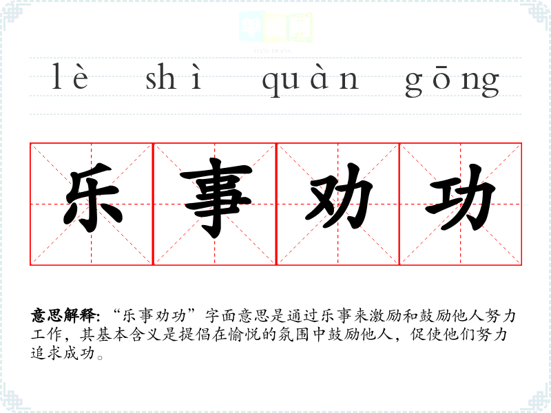“乐事劝功”字面意思是通过乐事来激励和鼓励他人努力工作,其基本含义是提倡在愉悦的氛围中鼓励他人,促使他们努力追求成功。