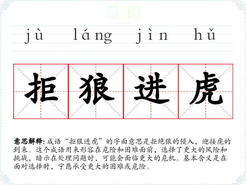 成语“拒狼进虎”的字面意思是拒绝狼的侵入,迎接虎的到来。这个成语用来形容在危险和困难面前,选择了更大的风险和挑战,暗示在处理问题时,可能会面临更大的危机。基本含义是在面对选择时,宁愿承受更大的困难或危险。