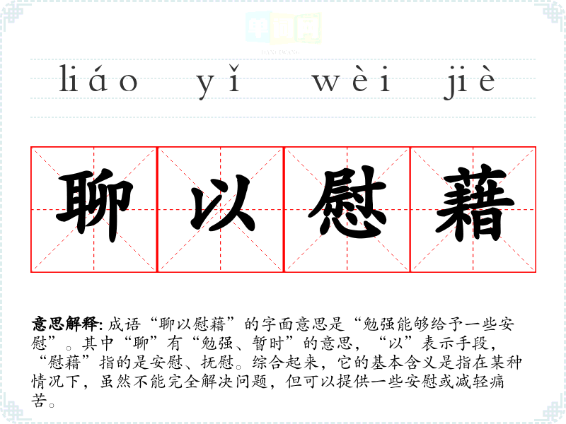 成语“聊以慰藉”的字面意思是“勉强能够给予一些安慰”。其中“聊”有“勉强、暂时”的意思,“以”表示手段,“慰藉”指的是安慰、抚慰。综合起来,它的基本含义是指在某种情况下,虽然不能完全解决问题,但可以提供一些安慰或减轻痛苦。
