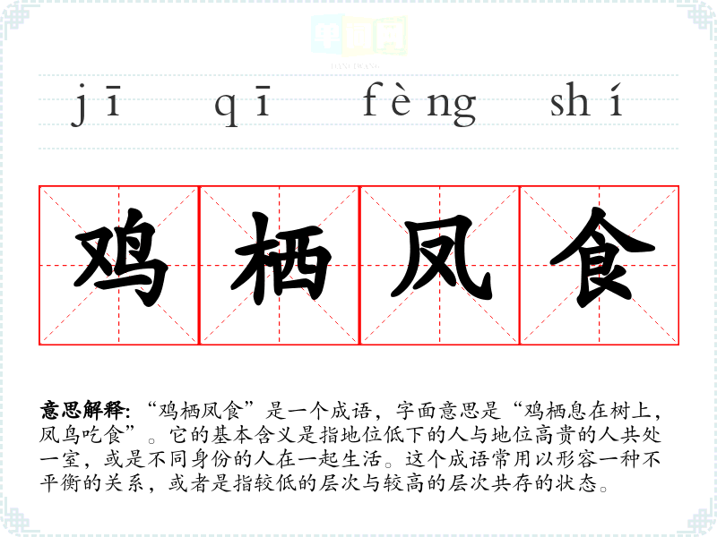 “鸡栖凤食”可能引发一种对不平等关系的反思,给人一种复杂的情感。它既包含了对高贵与低贱的对比,也隐含了一种社会的不公。联想上,它可能让我思考如何在不同社会层次中找到平衡与共存。