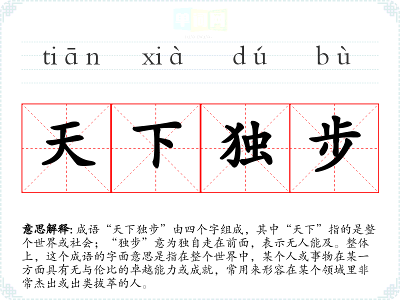 成语“天下独步”由四个字组成,其中“天下”指的是整个世界或社会;“独步”意为独自走在前面,表示无人能及。整体上,这个成语的字面意思是指在整个世界中,某个人或事物在某一方面具有无与伦比的卓越能力或成就,常用来形容在某个领域里非常杰出或出类拔萃的人。
