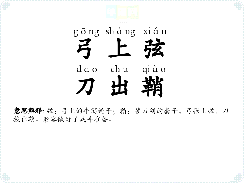| 弓弩上弦,刀剑出鞘 | 弦:弓上的牛筋绳子;鞘:装刀剑的套子。弓张上弦,刀拔出鞘。形容做好了战斗准备。 |