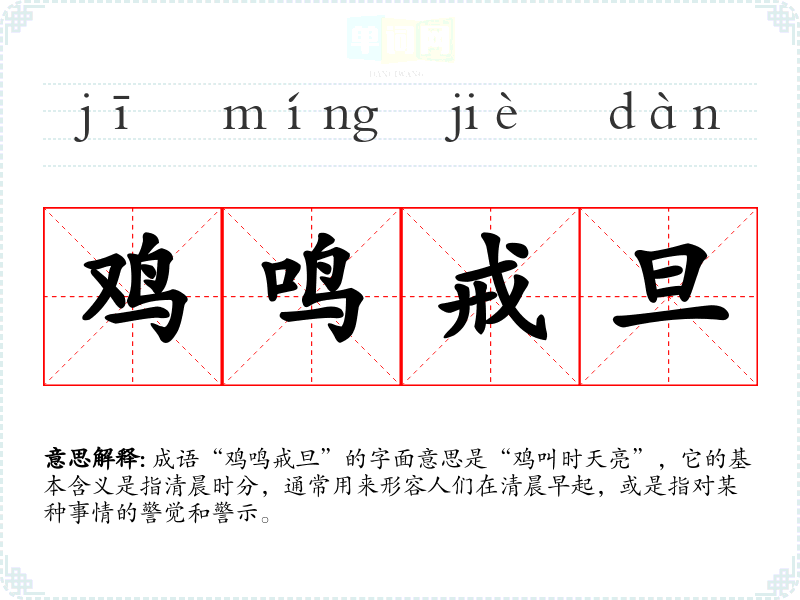 成语“鸡鸣戒旦”的字面意思是“鸡叫时天亮”,它的基本含义是指清晨时分,通常用来形容人们在清晨早起,或是指对某种事情的警觉和警示。