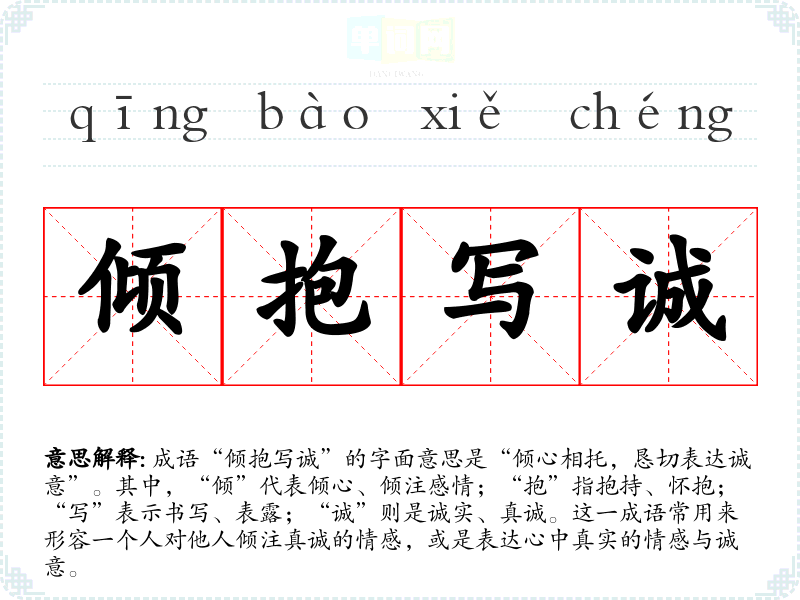 “倾抱写诚”并没有明确的历史典故或文学出处,但其构成的字词在**古代文学中常用于表达情感的真挚与诚恳。可以推测,这个成语可能是在一定的文化背景下逐渐演变而成,强调人与人之间真诚的交流与信任。