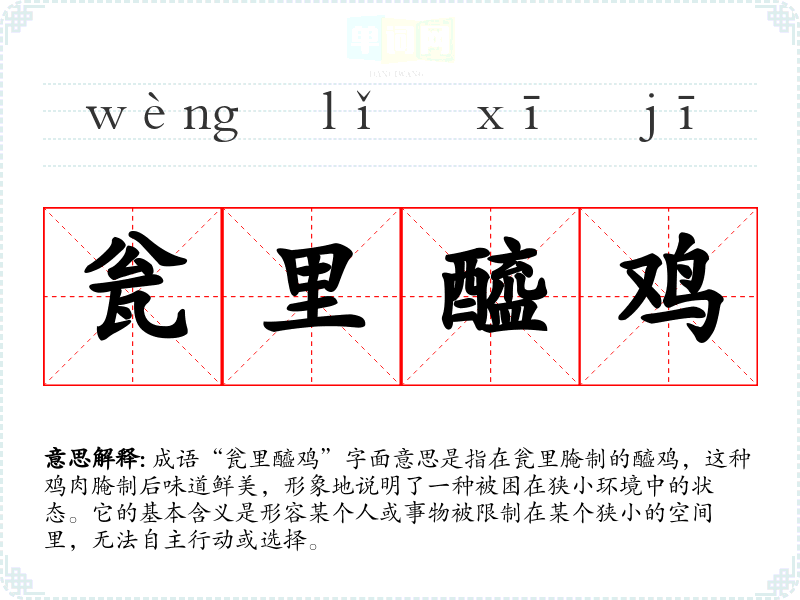成语“瓮里醯鸡”字面意思是指在瓮里腌制的醯鸡,这种鸡肉腌制后味道鲜美,形象地说明了一种被困在狭小环境中的状态。它的基本含义是形容某个人或事物被限制在某个狭小的空间里,无法自主行动或选择。