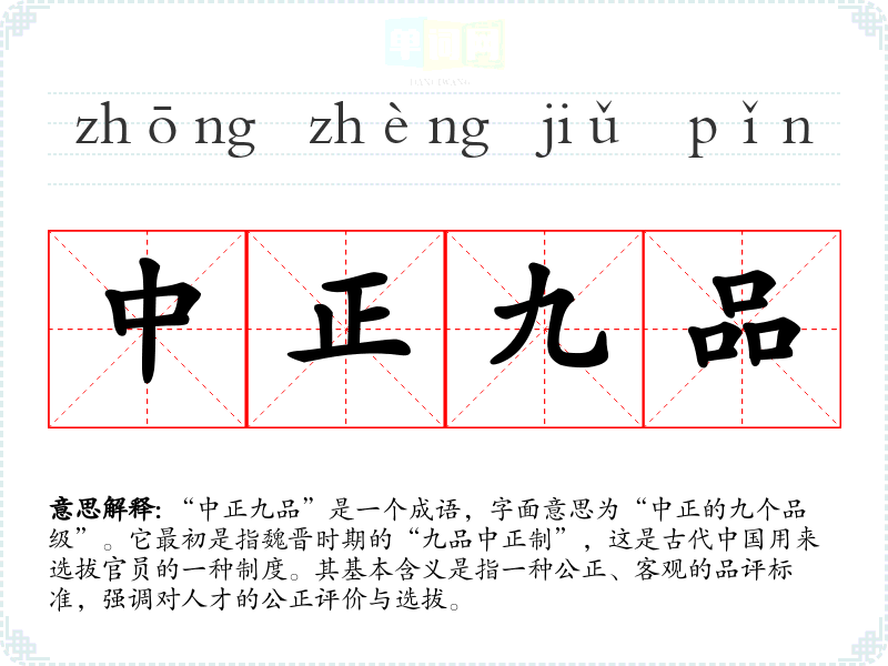 “中正九品”是一个成语,字面意思为“中正的九个品级”。它最初是指魏晋时期的“九品中正制”,这是古代**用来选拔官员的一种制度。其基本含义是指一种公正、客观的品评标准,强调对人才的公正评价与选拔。