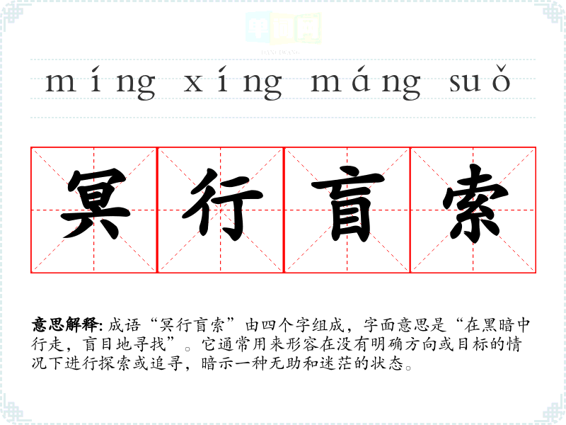 成语“冥行盲索”由四个字组成,字面意思是“在黑暗中行走,盲目地寻找”。它通常用来形容在没有明确方向或目标的情况下进行探索或追寻,暗示一种无助和迷茫的状态。
