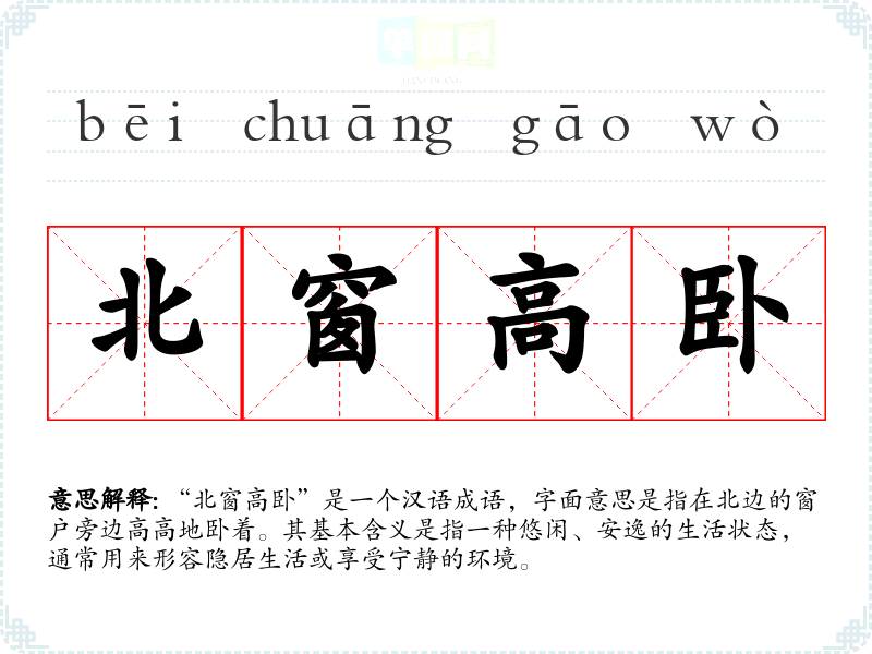 “北窗高卧”是一个汉语成语,字面意思是指在北边的窗户旁边高高地卧着。其基本含义是指一种悠闲、安逸的生活状态,通常用来形容隐居生活或享受宁静的环境。