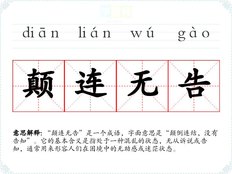 “颠连无告”是一个成语,字面意思是“颠倒连结,没有告知”。它的基本含义是指处于一种混乱的状态,无从诉说或告知,通常用来形容人们在困境中的无助感或迷茫状态。