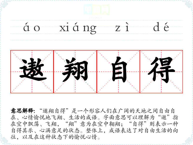 “遨翔自得”是一个形容人们在广阔的天地之间自由自在、心情愉悦地飞翔、生活的成语。字面意思可以理解为“遨”指在空中飘荡、飞翔,“翔”意为在空中翱翔;“自得”则表示一种自得其乐、心满意足的状态。整体上,成语表达了对自由生活的向往,以及在这种状态下的愉悦心情。
