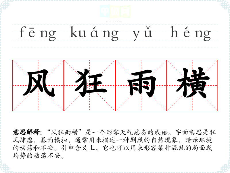 “风狂雨横”是一个形容天气恶劣的成语。字面意思是狂风肆虐,暴雨横扫,通常用来描述一种剧烈的自然现象,暗示环境的动荡和不安。引申含义上,它也可以用来形容某种混乱的局面或局势的动荡不安。